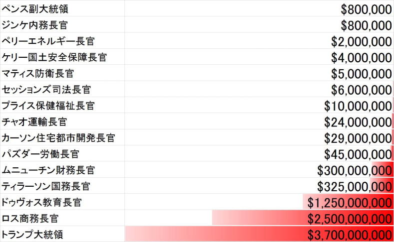 総資産の比較する場合、建国期と現代の貨幣価値が異なるという問題がある。したがって、現在の貨幣価値に換算している。例えばジョージ・ワシントンは遺言状を作成する際に資産価値を明らかにしているが、その総額は当時のお金で約53万ドルである。
